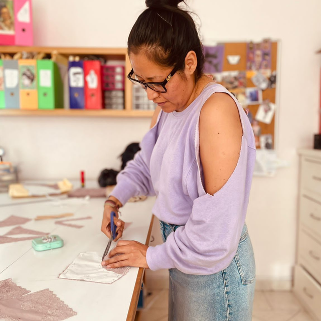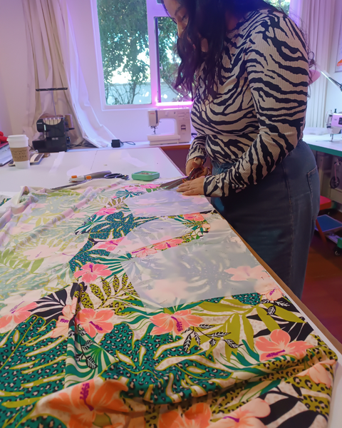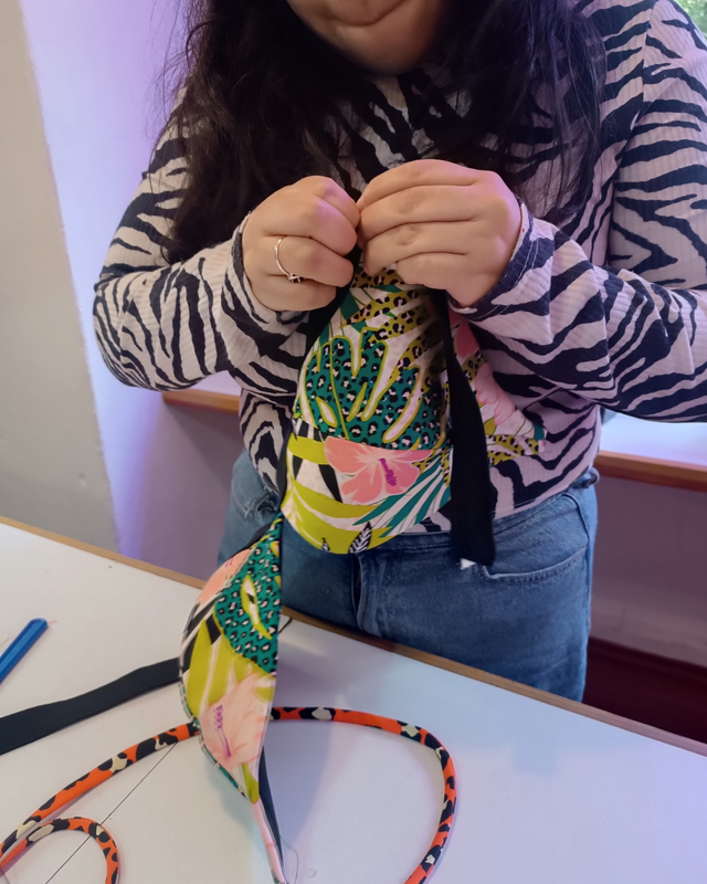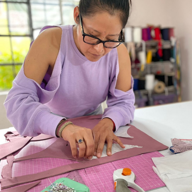 Llegas con la prenda que quieras hacer —o eliges un modelo del taller— y trabajamos juntas con patrones graduados, manuales paso a paso y una selección de telas hermosas listas para usar.